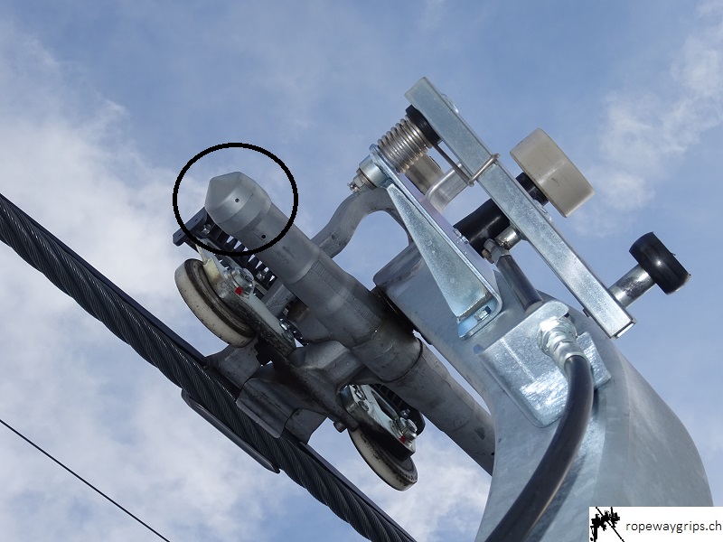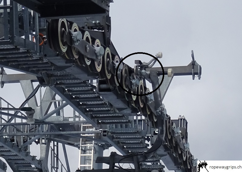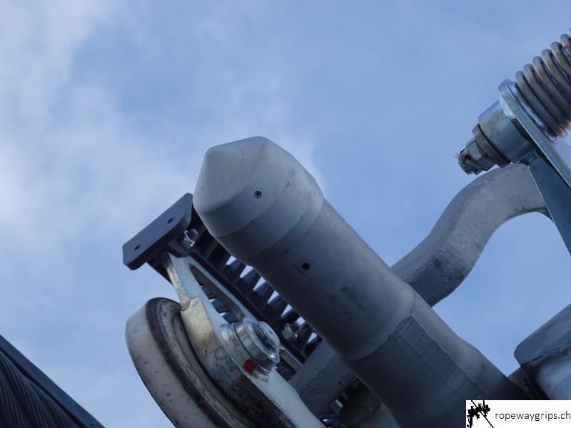 Beim Zwischenfall in Engelberg könnte der Gehängearm aufgrund einer Windböe (Quelle) in Richtung innere Fahrspur ausgependelt sein, während die Klemme zeitgleich eine Rollenbatterie überfuhr. Vermutlich stiess das vordere Drehrohr (blauer Deckel) gegen einen Seilfänger, wodurch die Klemme vom Förderseil ausgehebelt wurde. Dies ist jedoch eine reine Mutmassung meinerseits. Der Konus könnte in diesem Fall durch den Aufprall gegen den Seilfänger die Klemme wieder in die richtige Bahn lenken und ein Aushebeln verhindern. Ob und wann der Konus zum Einsatz kommt und ob es verschiedene Formen von Seilfängern gibt, ist mir unbekannt.